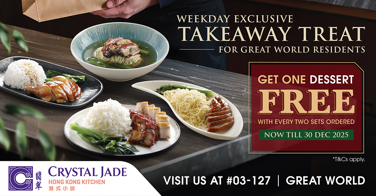 - Valid for takeaway only at Crystal Jade Hong Kong Kitchen (Great World), while stocks last.
