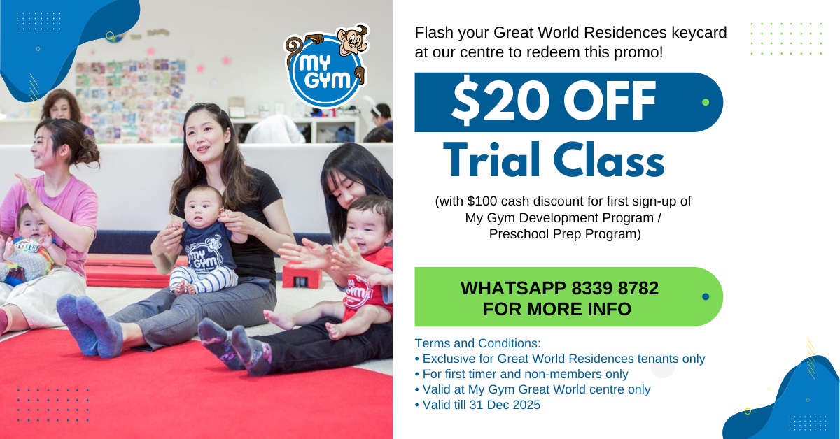 Enjoy a $20 off trial class + $100* cash discount for first sign-up of Gym Development Program / Preschool Prep Program at My Gym Great World.